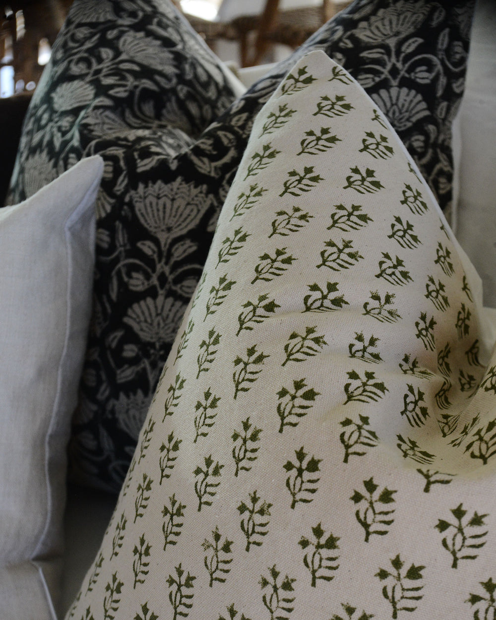 Aurélie features a natural ground with delicate green florals. Her back is made with a white linen and cotton blend, and she has a zipper for easy removal and cleaning.