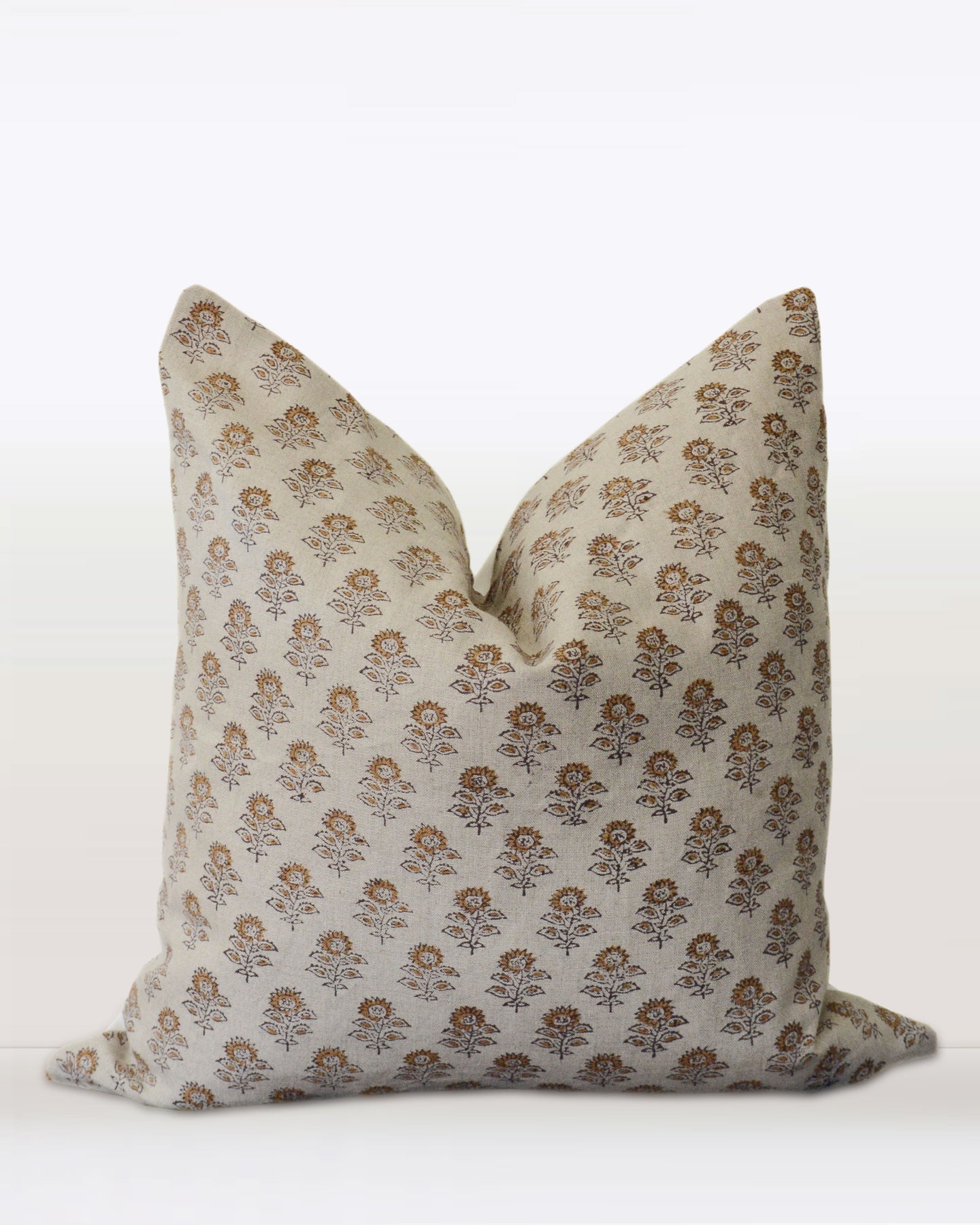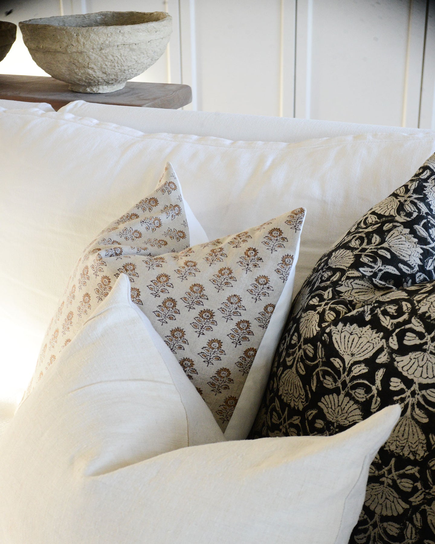 Céline features terra cotta and black hand blocked florals on a natural ground. Her back is made with a white linen and cotton blend, and she has a zipper for easy removal and cleaning.